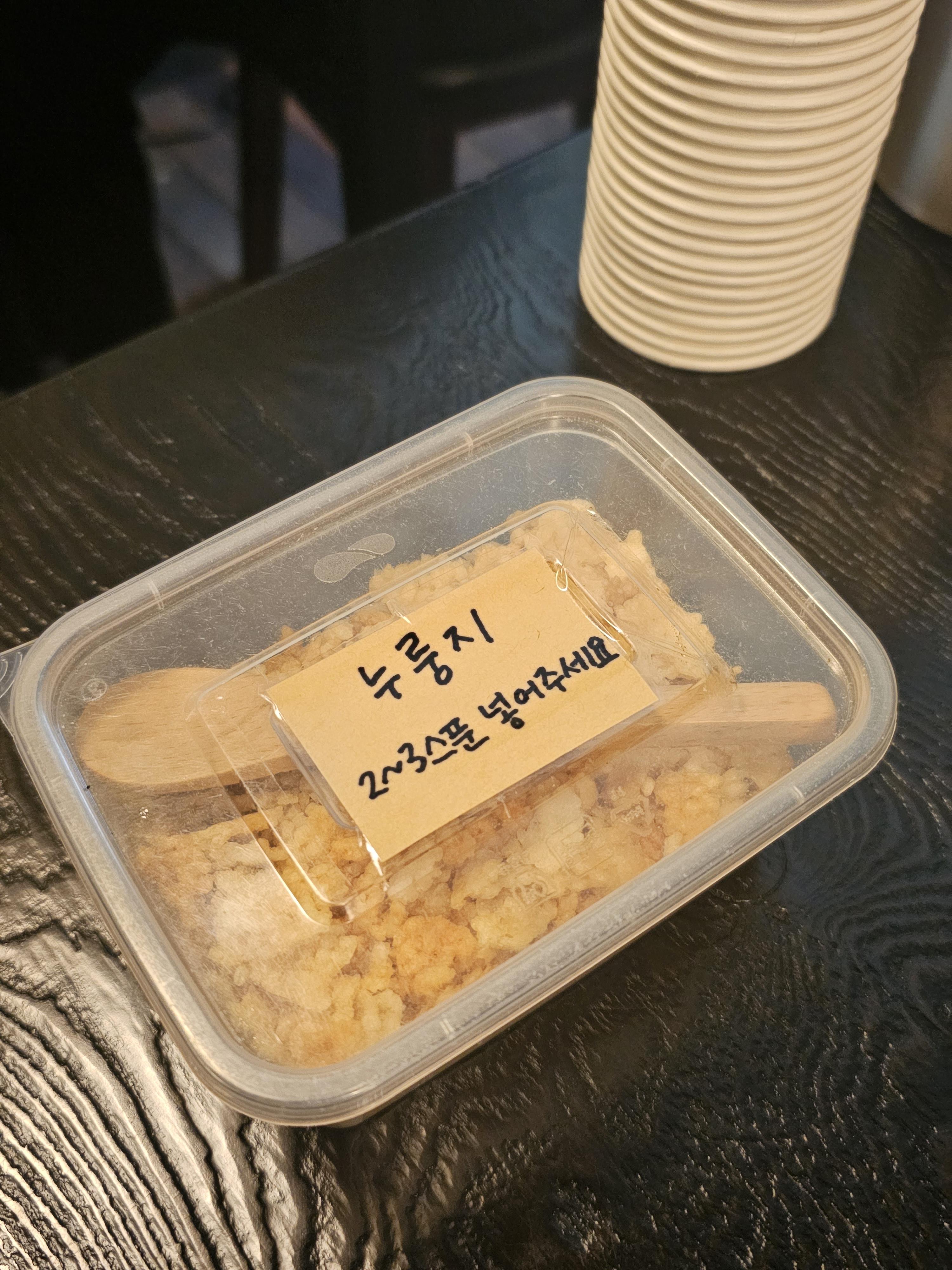 솥에 있는 밥을 밥그릇에 옮긴 후 따로 준비해 준 물과 테이블에 비치된 누룽지와 함께 부으면 누룽지로도 즐길 수 있다.